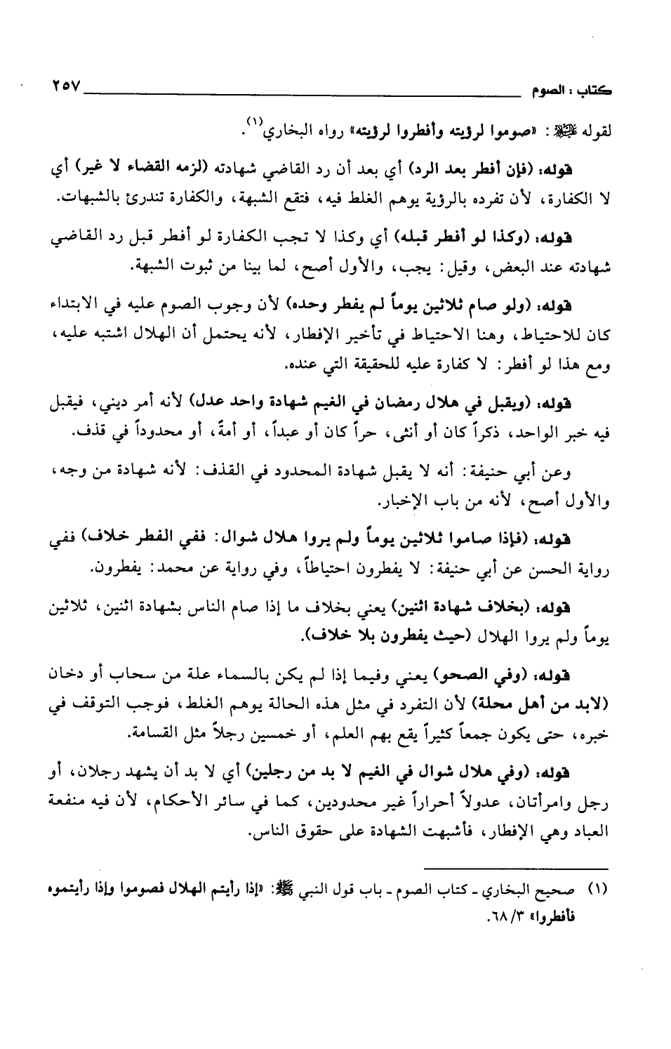 قوله: (وفي هلال شوال في الغيم لابد من رجلين) أي لابد أن يشهد رجلا، أو رجل وامرأتان، عدولاً أحراراً غير محدودين، كما في سائر الأحكام، لأن فيه منفعة العباد وهي الإفطار، فأشبهت الشهادة على حقوق الناس.