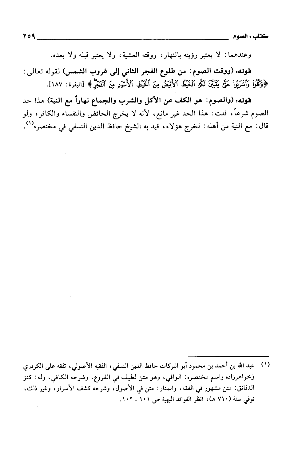 قوله: (والصوم: هو الكف عن الأكل والشرب والجماع نهاراً مع النية) هذا حد الصوم شرعاً، قلت: هذا الحد غير مانع، لأنه لا يخرج الحائض والنفساء والكافر، ولو قال: مع النية من أهله: لخرج هؤلاء، قيد به الشيخ حافظ الدين النسفي في مختصره.