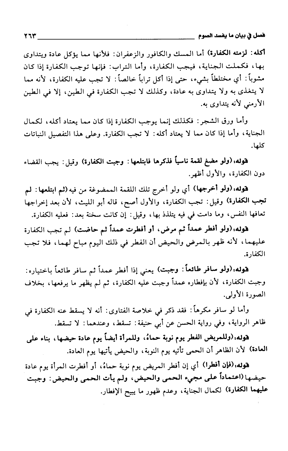 أكله: لزمته الكفارة) أما المسك والكافور والزعفران: فلأنها مما يؤكل عادة ويتداوى بها، فكملت الجناية، فيجب الكفارة، وأما التراب: فإنها توجب الكفارة إذا كان مشوباً: أي مختلطاً بشيء، حتى إذا أكل تراباً خالصاً: لا تجب عليه الكفارة، لأنه مما لا يتغذى به ولا يتداوى به عادة، وكذلك لا تجب الكفارة في الطين، إلا في الطين الأرمني لأنه يتداوى به.