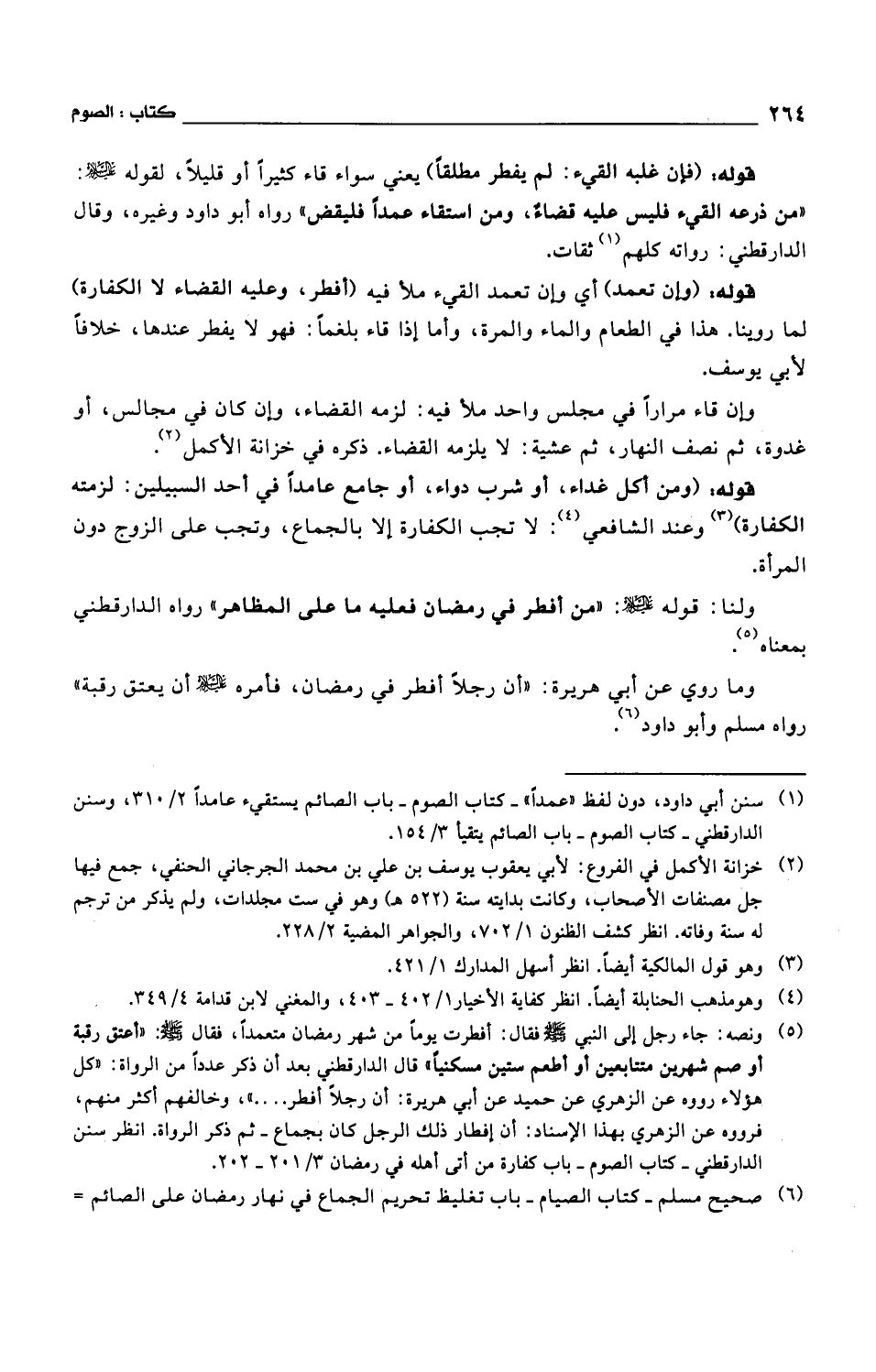 قوله: (وإن تعمد) أي وإن تعمد القيء ملأ فيه (أفطر، وعليه القضاء لا الكفارة) لما روينا. هذا في الطعام والماء والمرة، وأما إذا قاء بلغماً: فهو لا يفطر عندها، خلافاً لأبي يوسف.