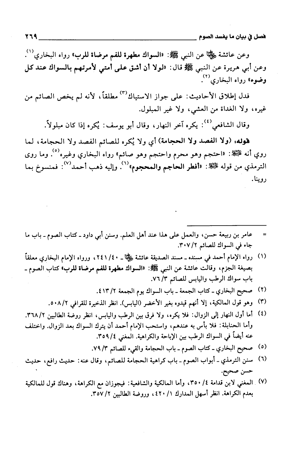 فدل إطلاق الأحاديث: على جواز الاستياك مطلقاً، لأنه لم يخص الصائم من غيره، ولا الغداة من العشي، ولا غير المبلول.