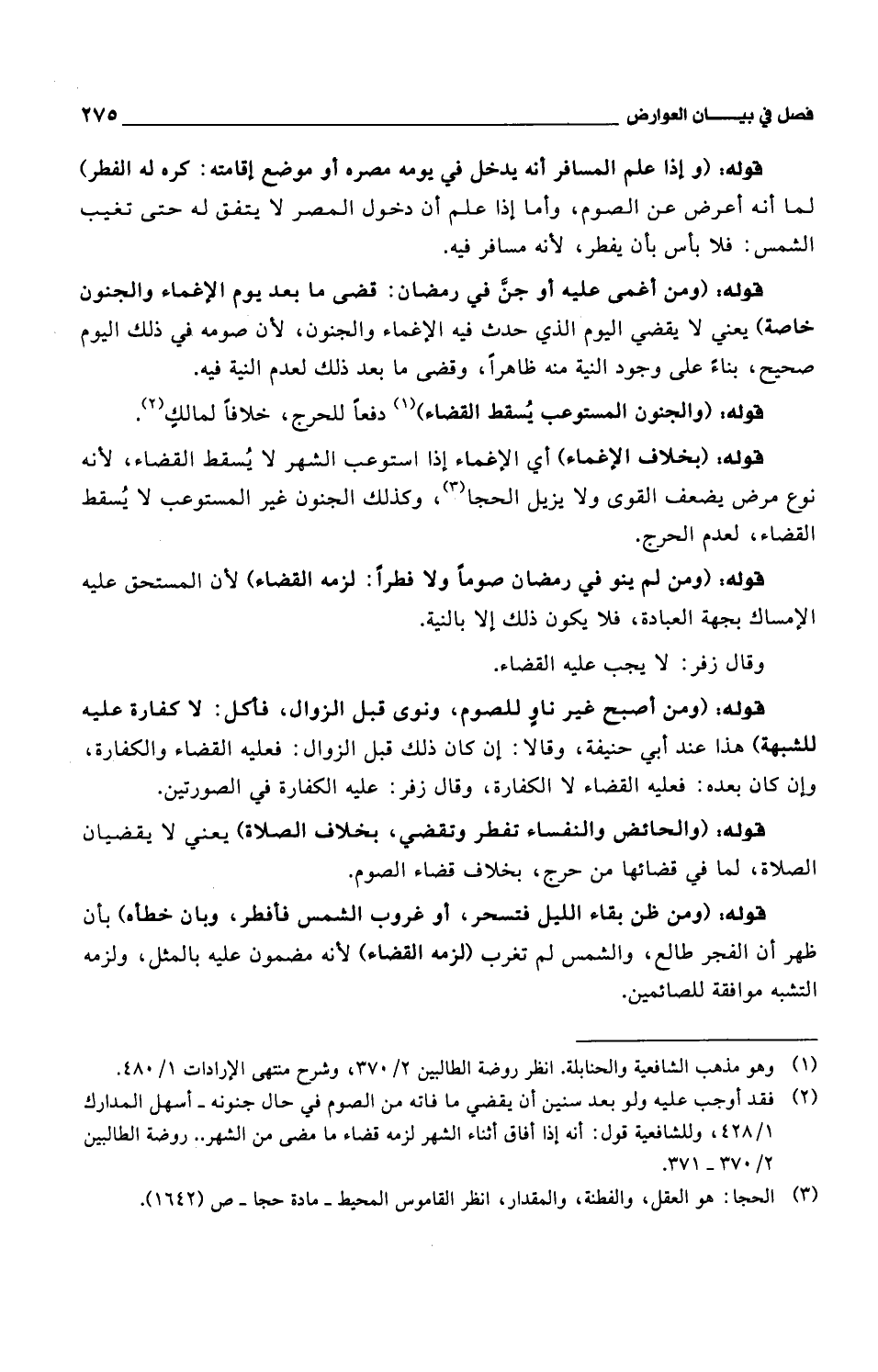 قوله: (ومن أغمى عليه أو جن في رمضان: قضى ما بعد يوم الإغماء والجنون خاصة) يعني لا يقضي اليوم الذي حدث فيه الإغماء والجنون، لأن صومه في ذلك اليوم صحيح، بناءً على وجود النية منه ظاهراً، وقضى ما بعد ذلك لعدم النية فيه.