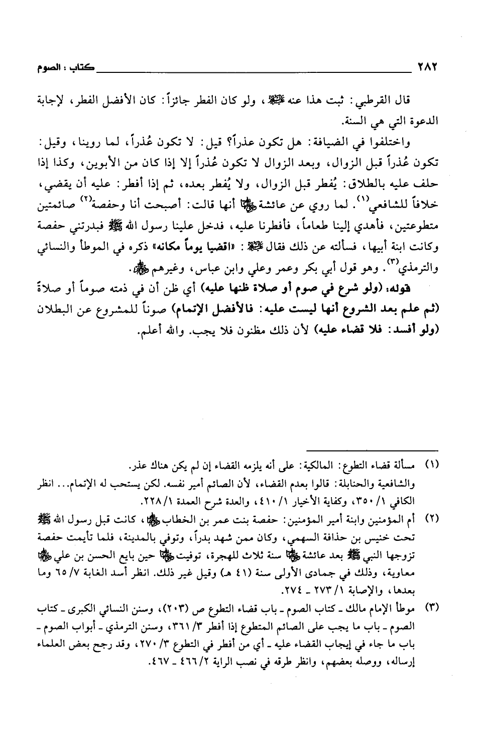 واختلفوا في الضيافة: هل تكون عذراً؟ قيل: لا تكون عذراً، لما روينا، وقيل: تكون عذراً قبل الزوال، وبعد الزوال لا تكون عذراً إلا إذا كان من الأبوين، وكذا إذا حلف عليه بالطلاق: يفطر قبل الزوال، ولا يفطر بعده، ثم إذا أفطر: عليه أن يقضي، خلافاً للشافعي. لما روي عن عائشة رضي الله عنها أنها قالت: أصبحت أنا وحفصة صائمتين متطوعتين، فأهدي إلينا طعاماً، فأفطرنا عليه، فدخل علينا رسول الله صلى الله عليه وسلم فبدرتني حفصة وكانت ابنة أبيها، فسألته عن ذلك فقال عليه السلام: "اقضيا يوماً مكانه" ذكره في الموطأ والنسائي والترمذي. وهو قول أبي بكر وعمر وعلي وابن عباس، وغيرهم رضي الله عنهم.