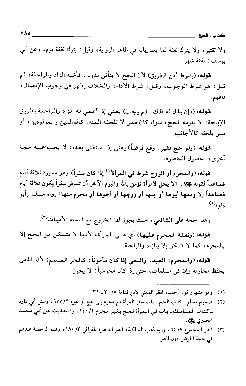قوله: (والمحرم أو الزوج شرط في المرأة إذا كان سفراً) وهو مسيرة ثلاثة أيام فصاعداً لقوله عليه السلام: "لا يحل لامرأة تؤمن بالله واليوم الآخر أن تسافر سفراً يكون ثلاثة أيام فصاعداً إلا ومعها أبوها أو ابنها أو زوجها أو أخوها أو محرم منها" رواه مسلم وأبو داود.