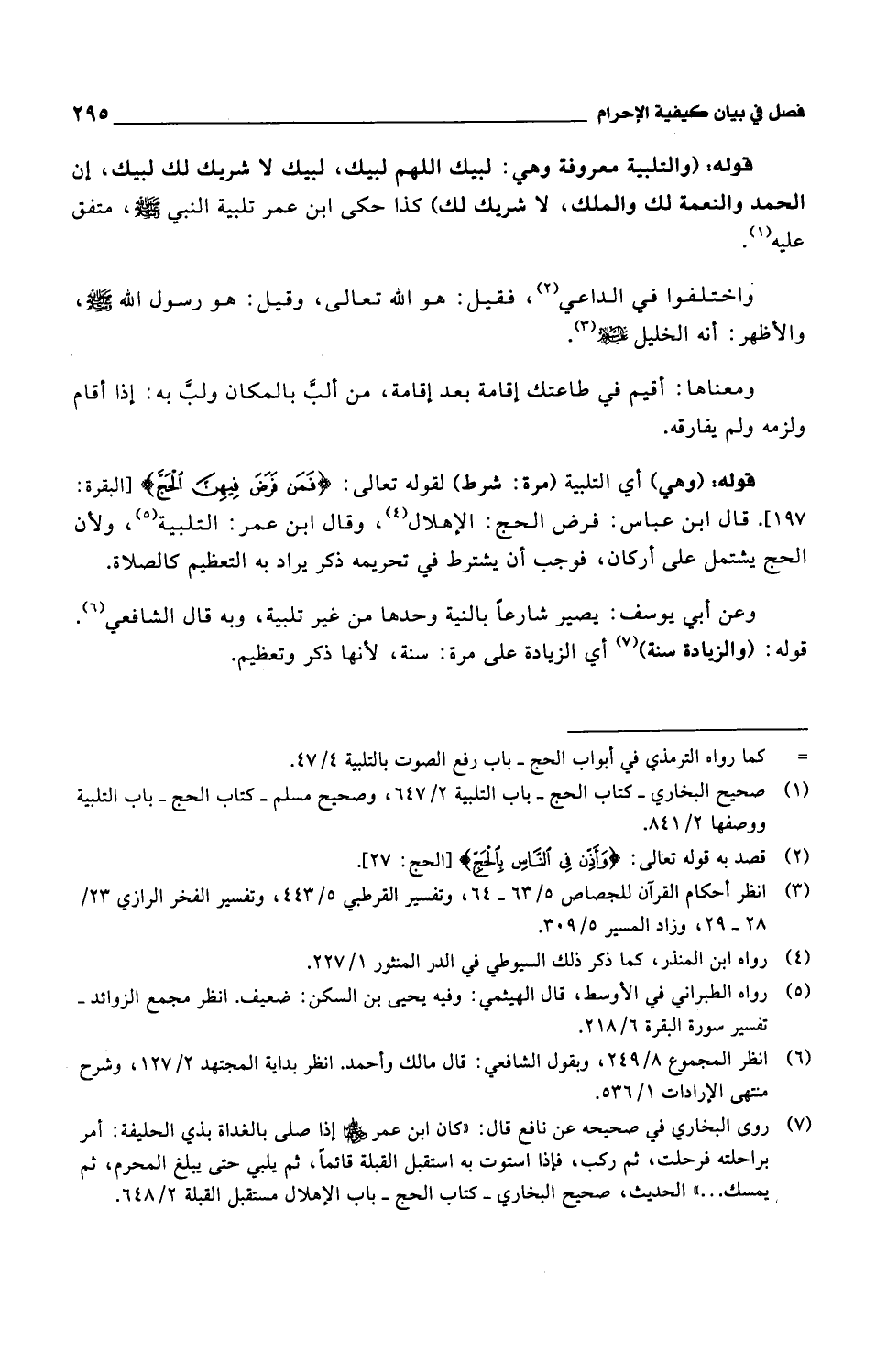 قوله: (وهي) أي التلبية (مرة: شرط) لقوله تعالى: {فَمَنْ فَرَضَ فِيهِنَّ الْحَجَّ} [البقرة: 197]. قال ابن عباس: فرض الحج: الإهلال، وقال ابن عمر: التلبية، ولأن الحج يشتمل على أركان، فوجب أن يشترط في تحريمه ذكر يراد به التعظيم كالصلاة.