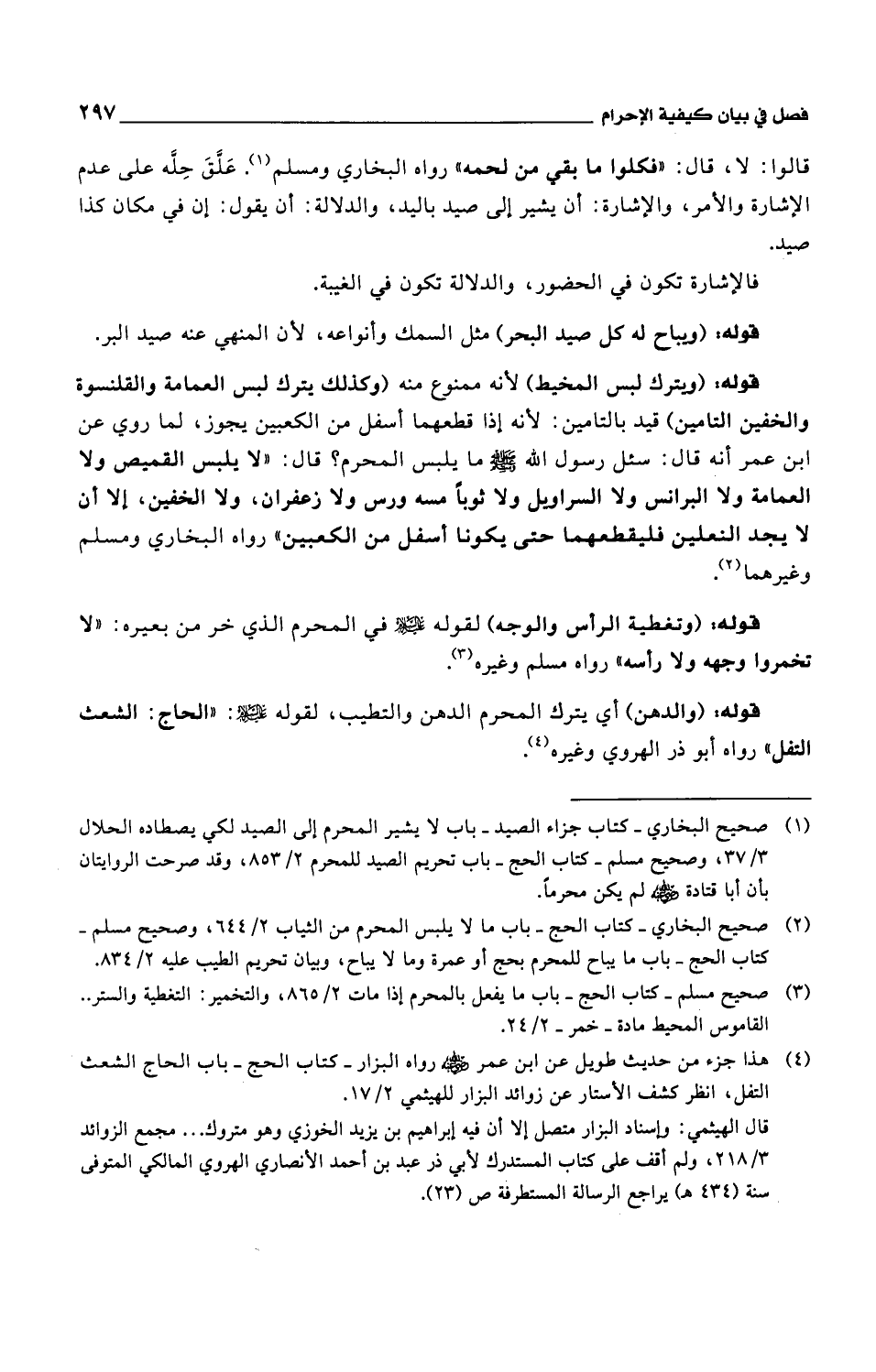 قوله: (ويترك لبس المخيط) لأنه ممنوع منه (وكذلك يترك لبس العمامة والقلنسوة والخفين التامين) قيد بالتامين: لأنه إذا قطعهما أسفل من الكعبين يجوز، لما روي عن ابن عمر أنه قال: سئل رسول الله صلى الله عليه وسلم ما يلبس المحرم؟ قال: "لا يلبس القميص ولا العمامة ولا البرانس ولا السراويل ولا ثوباً مسه ورس ولا زعفران، ولا الخفين، إلا أن لا يجد النعلين فليقطعهما حتى يكونا أسفل من الكعبين" رواه البخاري ومسلم وغيرهما.