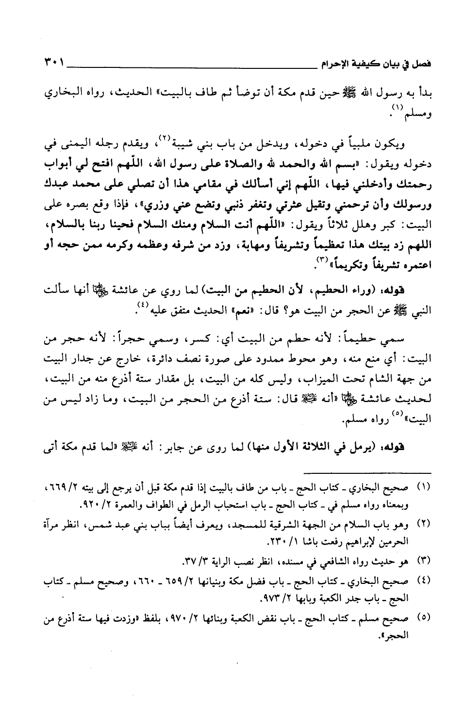 سمي حطيماً: لأنه حطم من البيت أي: كسر، وسمي حجراً: لأنه حجر من البيت: أي منع منه، وهو محوط ممدود على صورة نصف دائرة، خارج عن جدار البيت من جهة الشام تحت الميزاب، وليس كله من البيت، بل مقدار ستة أذرع منه من البيت، لحديث عائشة رضي الله عنها "أنه عليه السلام قال: ستة أذرع من الحجر من البيت، وما زاد ليس من البيت" رواه مسلم.