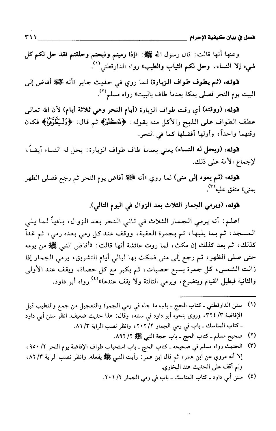 وعنها أنها قالت: قال رسول الله صلى الله عليه وسلم: "إذا رميتم وذبحتم وحلقتم فقد حل لكم كل شيء إلا النساء، وحل لكم الثياب والطيب" رواه الدارقطني.