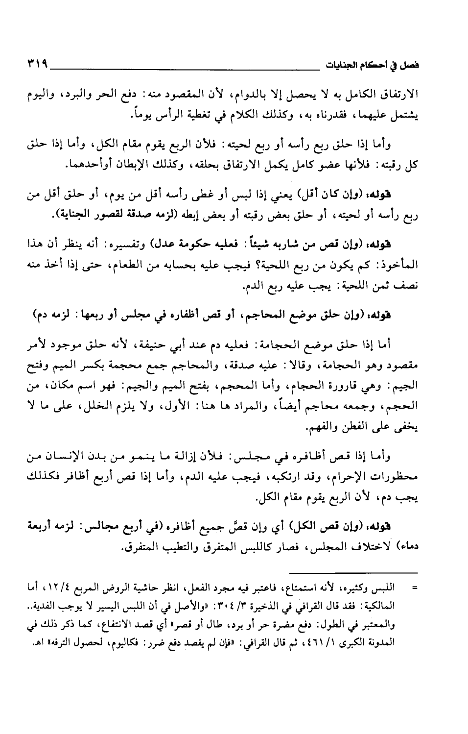 وأما إذا حلق ربع رأسه أو ربع لحيته: فلأن الربع يقوم مقام الكل، وأما إذا حلق كل رقبته: فلأنها عضو كامل يكمل الارتفاق بحلقه، وكذلك الإبطان أو أحدهما.