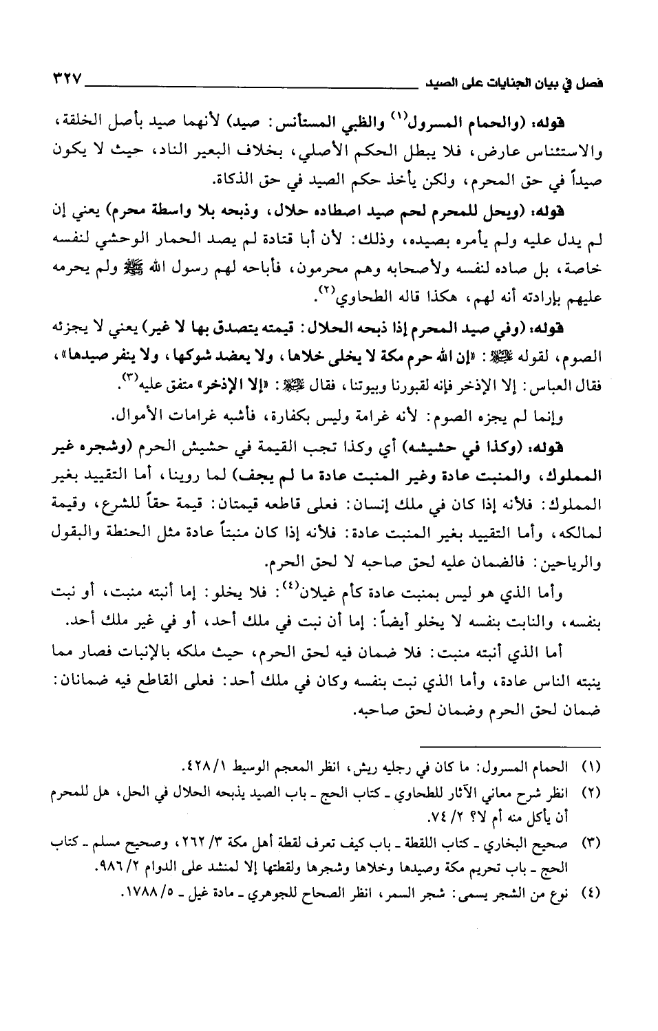 قوله: (والحمام المسرول والظبي المستأنس: صيد) لأنهما صيد بأصل الخلقة، والاستئناس عارض، فلا يبطل الحكم الأصلي، بخلاف البعير الناد، حيث لا يكون صيداً في حق المحرم، ولكن يأخذ حكم الصيد في حق الذكاة.
