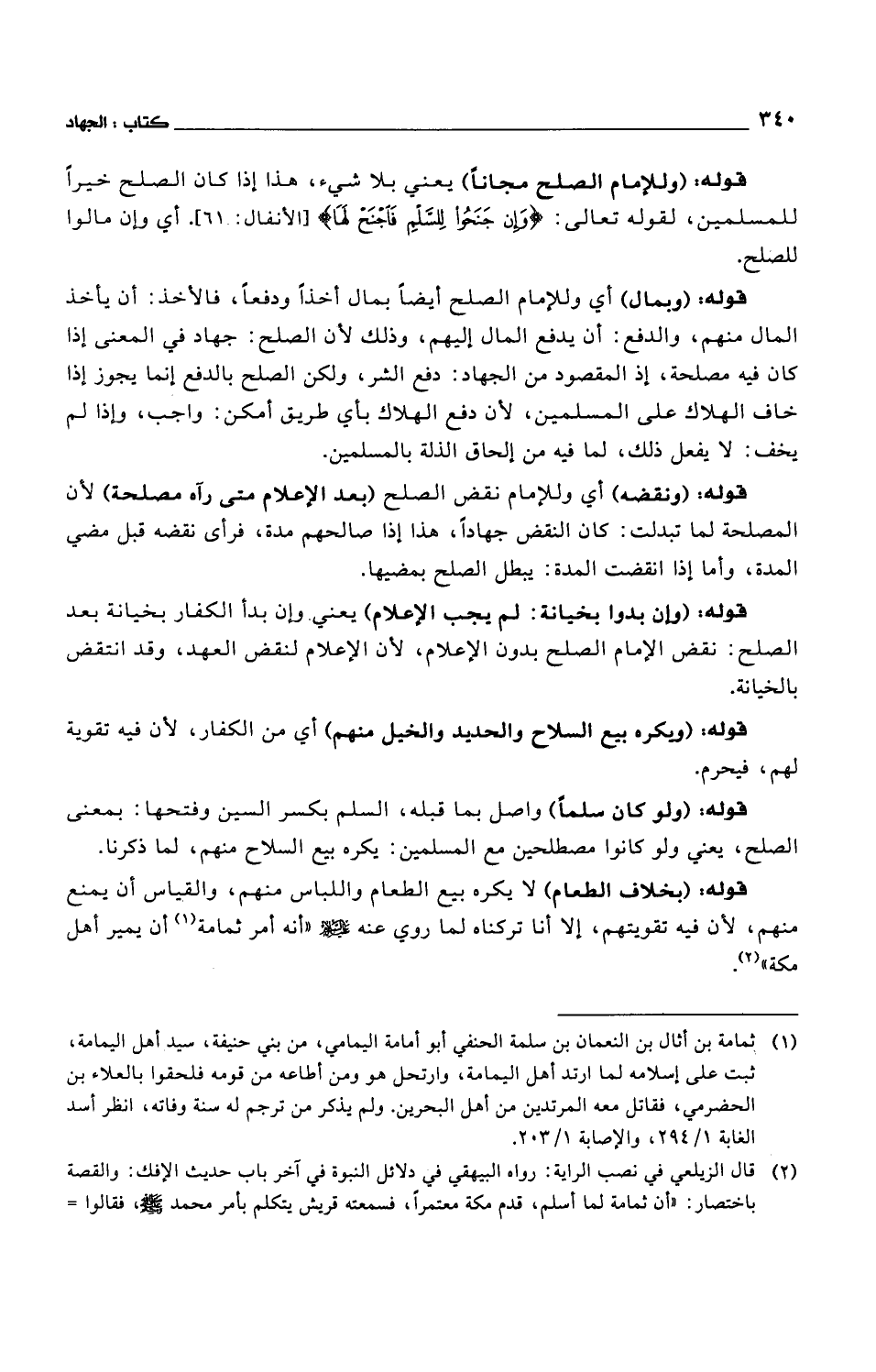 قوله: (وبمال) أي وللإمام الصلح أيضاً بمال أخذاً ودفعاً، فالأخذ: أن يأخذ المال منهم، والدفع: أن يدفع المال إليهم، وذلك لأن الصلح: جهاد في المعنى إذا كان فيه مصلحة، إذ المقصود من الجهاد: دفع الشر، ولكن الصلح بالدفع إنما يجوز إذا خاف الهلاك على المسلمين، لأن دفع الهلاك بأي طريق أمكن: واجب، وإذا لم يخف: لا يفعل ذلك، لما فيه من إلحاق الذلة بالمسلمين.
