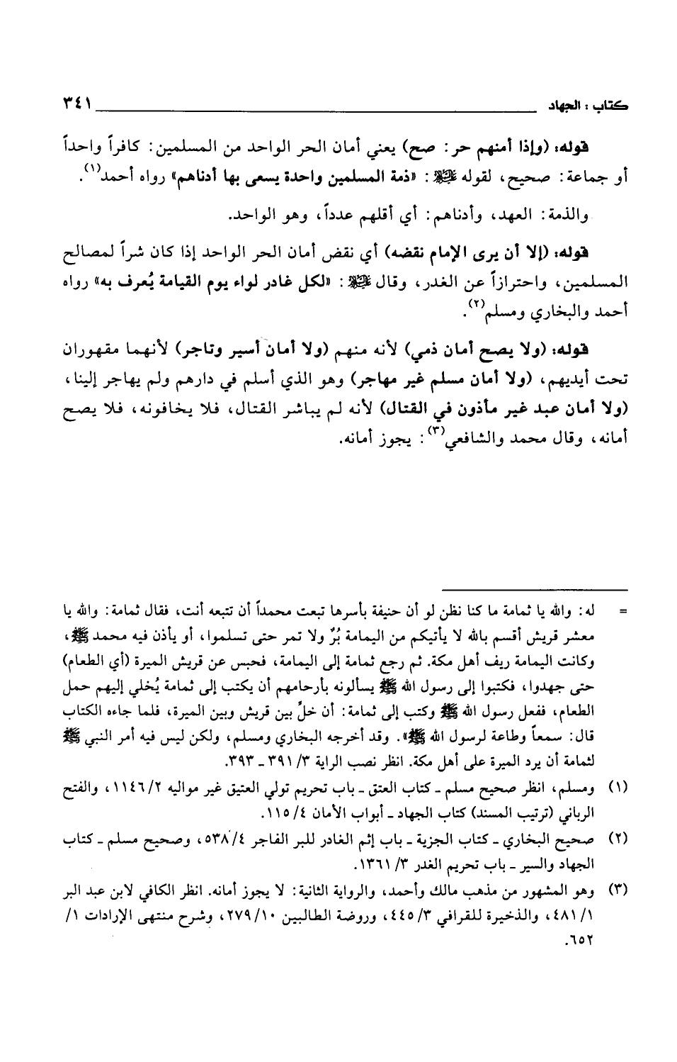 قوله: (إلا أن يرى الإمام نقضه) أي نقض أمان الحر الواحد إذا كان شراً لمصالح المسلمين، واحترازاً عن الغدر، وقال عليه السلام: "لكل غادر لواء يوم القيامة يعرف به" رواه أحمد والبخاري ومسلم.