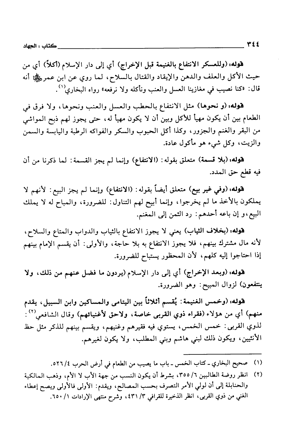 قوله: (وللعسكر الانتفاع بالغنيمة قبل الإخراج) أي إلى دار الإسلام (أكلاً) أي من حيث الأكل والعلف والدهن والإيقاد والقتال بالسلاح، لما روي عن ابن عمر رضي الله عنه أنه قال: "كنا نصيب في مغازينا العسل والعنب ونأكله ولا نرفعه" رواه البخاري.