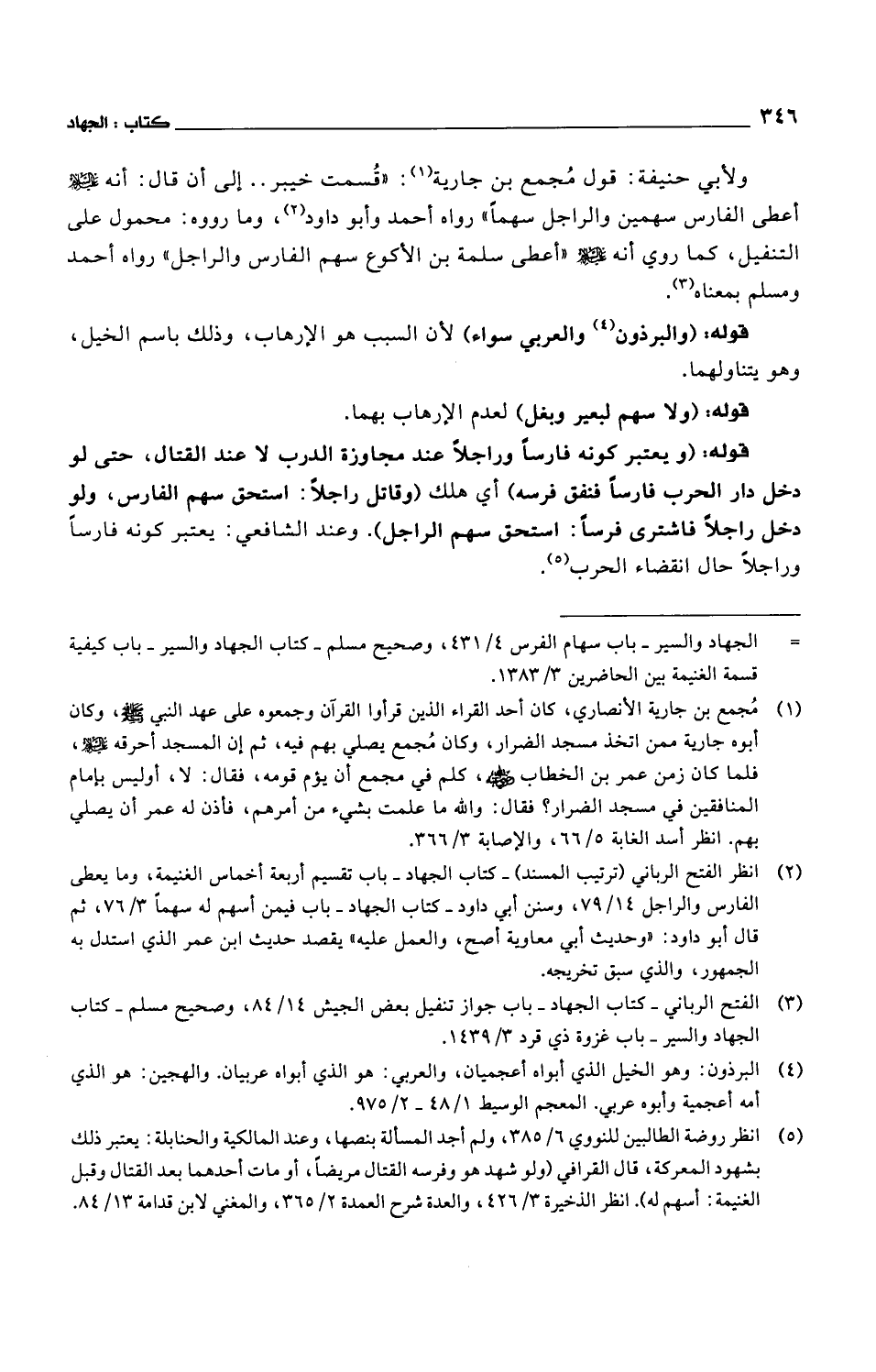 ولأبي حنيفة: قول مجمع بن جارية: "قسمت خيبر .. إلى أن قال: أنه عليه السلام أعطى الفارس سهمين والراجل سهماً" رواه أحمد وأبو داود، وما رووه: محمول على التنفيل، كما روي أنه عليه السلام "أعطى سلمة بن الأكوع سهم الفارس والراجل" رواه أحمد ومسلم بمعناه.