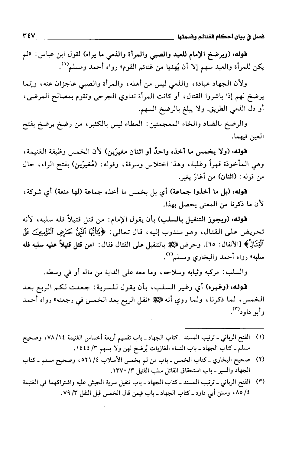 قوله: (ويرضخ الإمام للعبد والصبي والمرأة والذمي ما يراه) لقول ابن عباس: "لم يكن للمرأة والعبد سهم إلا أن يهديا من غنائم القوم" رواه أحمد ومسلم.