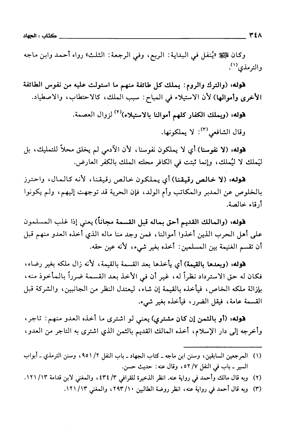 قوله: (والترك والروم: يملك كل طائفة منهم ما استولت عليه من نفوس الطائفة الأخرى وأموالها) لأن الاستيلاء في المباح: سبب الملك، كالاحتطاب، والاصطياد.