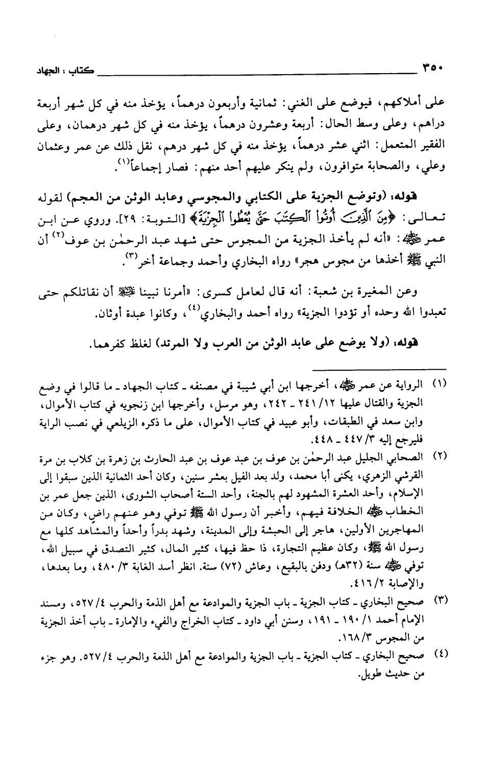 على أملاكهم، فيوضع على الغني: ثمانية وأربعون درهماً، يؤخذ منه في كل شهر أربعة دراهم، وعلى وسط الحال: أربعة وعشرون درهماً، يؤخذ منه في كل شهر درهمان، وعلى الفقير المتعمل: اثني عشر درهماً، يؤخذ منه في كل شهر درهم، نقل ذلك عن عمر وعثمان وعلي، والصحابة متوافرون، ولم ينكر عليهم أحد منهم: فصار إجماعاً.