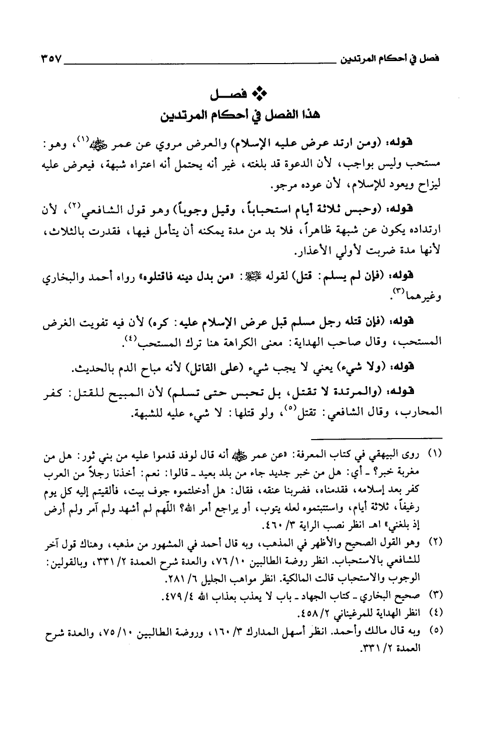 قوله: (ومن ارتد عرض عليه الإسلام) والعرض مروي عن عمر رضي الله عنه، وهو: مستحب وليس بواجب، لأن الدعوة قد بلغته، غير أنه يحتمل أنه اعتراه شبهة، فيعرض عليه ليزاح ويعود للإسلام، لأن عوده مرجو.