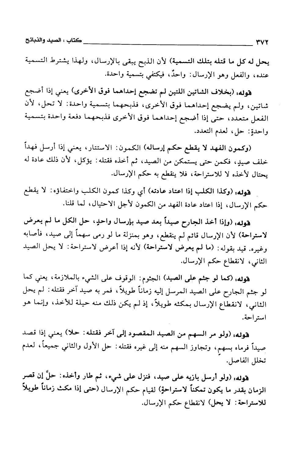 قوله: (وإذا أخذ الجارح صيداً بعد صيد بإرسال واحد، حل الكل ما لم يعرض لاستراحة) لأن الإرسال قائم لم ينقطع، وهو بمنزلة ما لو رمى سهماً إلى صيد، فأصابه وغيره. قيد بقوله: (ما لم يعرض لاستراحة) لأنه إذا أعرض لاستراحة: لا يحل الصيد الثاني، لانقطاع حكم الإرسال.