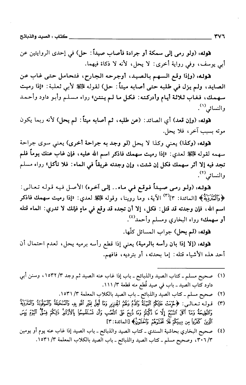 قوله: (وإذا وقع السهم بالصيد، أو جرحه الجارح، فتحامل حتى غاب عن الصايد، ولم يزل في طلبه حتى اصابه ميتاً: حل) لقوله عليه السلام لأبي ثعلبة: "إذا رميت سهمك، فغاب ثلاثة أيام وأدركته: فكل ما لم ينتن" رواه مسلم وأبو داود وأحمد والنسائي.