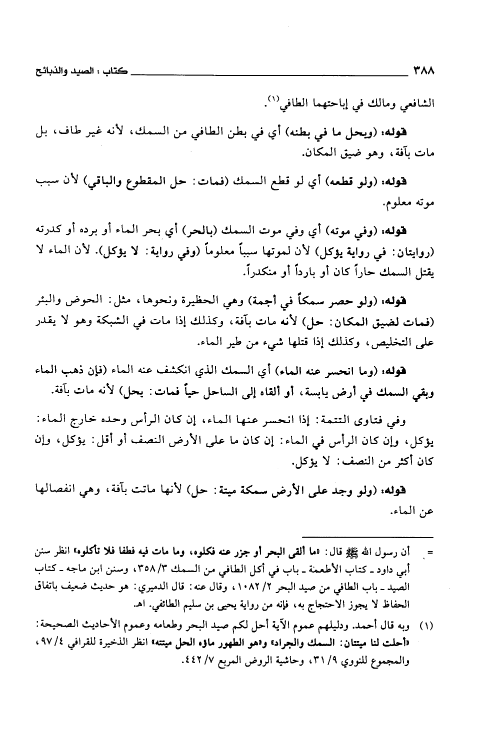 قوله: (وما انحسر عنه الماء) أي السمك الذي انكشف عنه الماء (فإن ذهب الماء وبقي السمك في أرض يابسة، أو ألقاه إلى الساحل حياً فمات: يحل) لأنه مات بآفة.