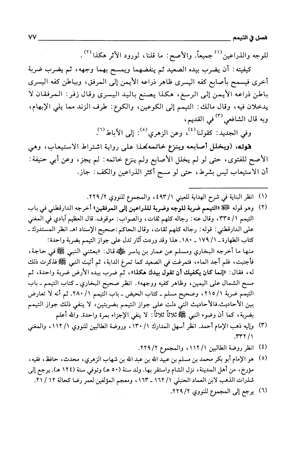 كيفيته: أن يضرب بيده الصعيد ثم ينفضهما ويمسح بهما وجهه، ثم يضرب ضربة أخرى فيسمح بأصابع كفه اليسرى ظاهر ذراعه الأيمن إلى المرفق، وبباطن كفه اليسرى باطن ذراعه الأيمن إلى الرسغ، هكذا يصنع باليد اليسرى وقال زفر: المرفقان لا يدخلان فيه، وقال مالك: التيمم إلى الكوعين، والكوع: طرف الزند مما يلي الإبهام، وبه قال الشافعي في القديم.