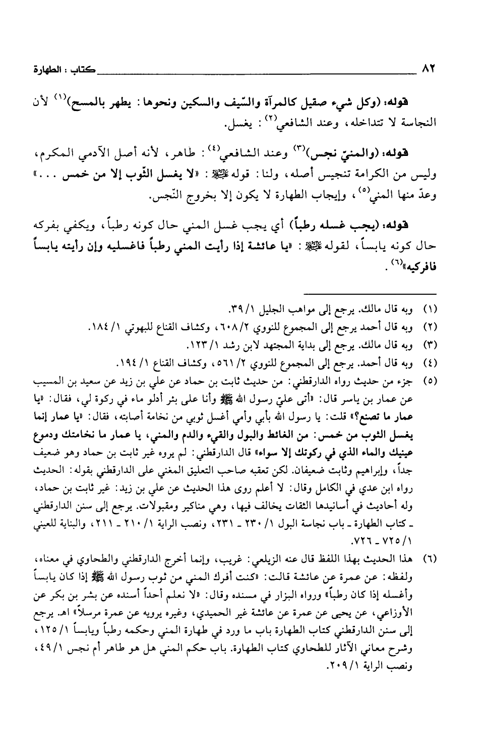 قوله: (والمني نجس) وعند الشافعي: طاهر، لأنه أصل الآدمي المكرم، وليس من الكرامة تنجيس أصله، ولنا: قوله عليه السلام: "لا يغسل الثوب إلا من خمس ... " وعد منها المني، وإيجاب الطهارة لا يكون إلا بخروج النجس.