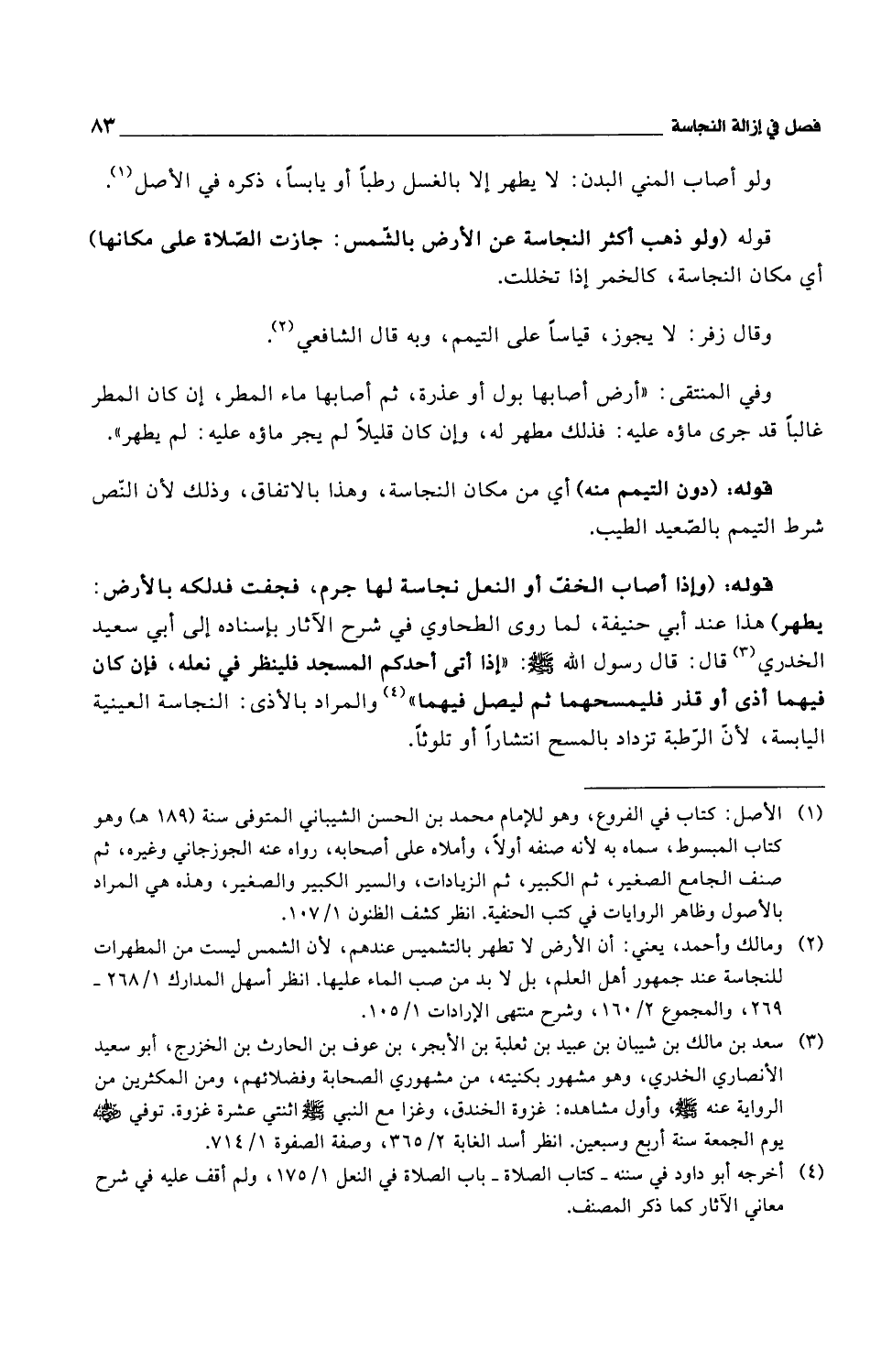 قوله: (وإذا أصاب الخف أو النعل نجاسة لها جرم، فجفت فدلكه بالأرض: يطهر) هذا عند أبي حنيفة، لما روى الطحاوي في شرح الآثار بإسناده إلى أبي سعيد الخدري قال: قال رسول الله صلى الله عليه وسلم: "إذا أتى أحدكم المسجد فلينظر في نعله، فإن كان فيهما أذى أو قذر فليمسحهما ثم ليصل فيهما" والمراد بالأذى: النجاسة العينية اليابسة، لأن الرطبة تزداد بالمسح انتشاراً أو تلوثاً.