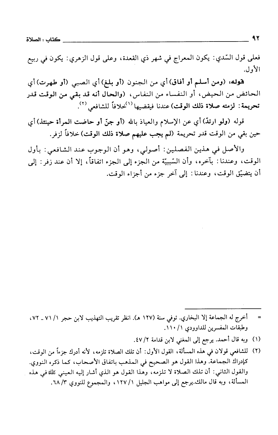 قوله: (ومن أسلم أو أفاق) أي من الجنون (أو بلغ) أي الصبي (أو طهرت) أي الحائض من الحيض، أو النفساء من النفاس، (والحال أنه قد بقي من الوقت قدر تحريمة: لزمته صلاة ذلك الوقت) عندنا فيقضيها خلافاً للشافعي.