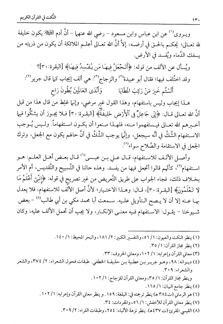 وأصل الألف للاستفهام، قال علي بن عيسى قال بعض أهل العلم: هو استفهام، كأنهم قالوا أتجعل فيها من يفسد. وهذا حالنا في التسبيح والتقديس، أم الأمر بخلاف ذلك، فجاء الجواب على طريق التعريض من غير تصريحٍ في قوله: {إِنِّي أَعْلَمُ مَا لَا تَعْلَمُونَ} [البقرة: 30] ، قال: وهذا الاختيار؛ لأن أصل الألف للاستفهام، فلا يعدل بها عنه إلا أن لا يصح التأويل عليه. سمعت أبا محمد مكي بن أبي طالب - بعض شيوخنا - يقول: الاستفهام فيه معنى الإنكار، ولا يجب أن تحمل الألف عليه، وكان