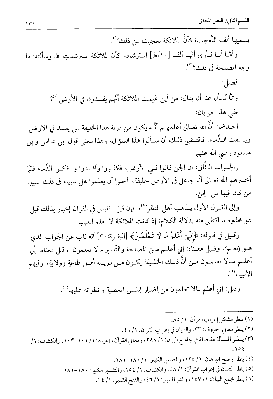 وقيل في قوله: {إِنِّي أَعْلَمُ مَا لَا تَعْلَمُونَ} [البقرة: 30] أنه ناب عن الجواب الذي هو (نعم) . وقيل معناه: إني أعلم من المصلحة والتدبير مالا تعلمون. وقيل معناه: إني أعلم مالا تعلمون من أن ذلك الخليفة يكون من ذريته أهل طاعةٍ وولايةٍ، وفيهم الأنبياء.