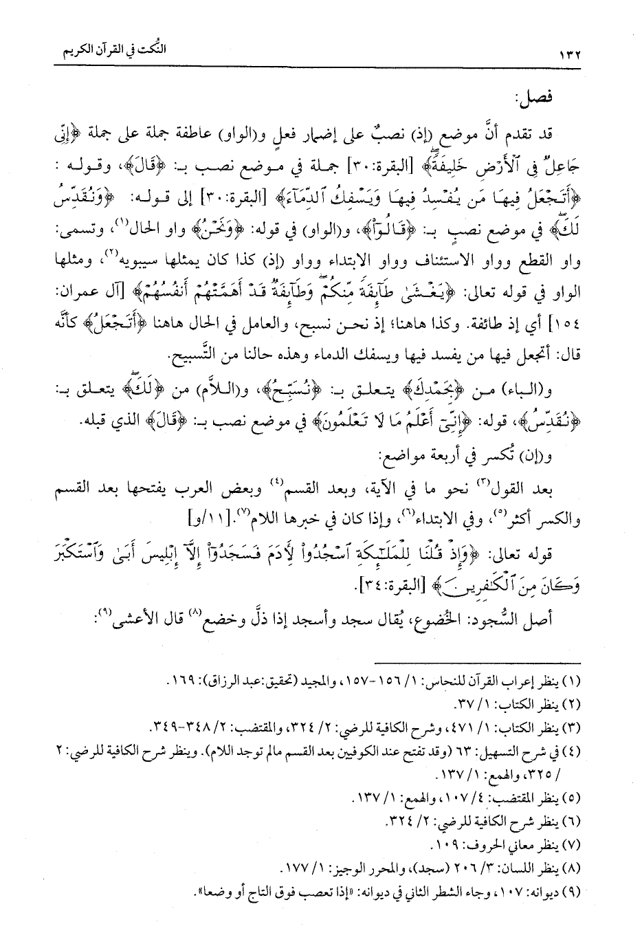 قد تقدم أن موضع (إذ) نصب على إضمار فعل و (الواو) عاطفة جملة {إِنِّي جَاعِلٌ فِي الْأَرْضِ خَلِيفَةً} [البقرة: 30] جملة في موضع نصب بـ: {قَالَ} ، قوله: {أَتَجْعَلُ فِيهَا مَنْ يُفْسِدُ فِيهَا وَيَسْفِكُ الدِّمَاءَ} [البقرة: 30] إلي قوله: {وَنُقَدِّسُ لَكَ} في موضع نصب بـ: {قَالُواْ} ، و (الواو) في قوله: {وَنَحْنُ} واو الحال، وتسمى: واو القطع وواو الاستئناف وواو الابتداء وواو (إذ) كذا كان يمثلها سيبويه، ومثلها الواو في قوله تعالى: {يَغْشَى طَائِفَةً مِنْكُمْ وَطَائِفَةٌ قَدْ أَهَمَّتْهُمْ أَنْفُسُهُمْ} [آل عمران: 154] أي إذ طائفة. كذا هاهنا؛ إذ نحن نسبح، والعامل في الحال هاهنا {أَتَجْعَلُ} كأنَّه قال: أتجعل فيها من يفسد فيها ويسفك الدماء وهذه حالنا من التسبيح.
