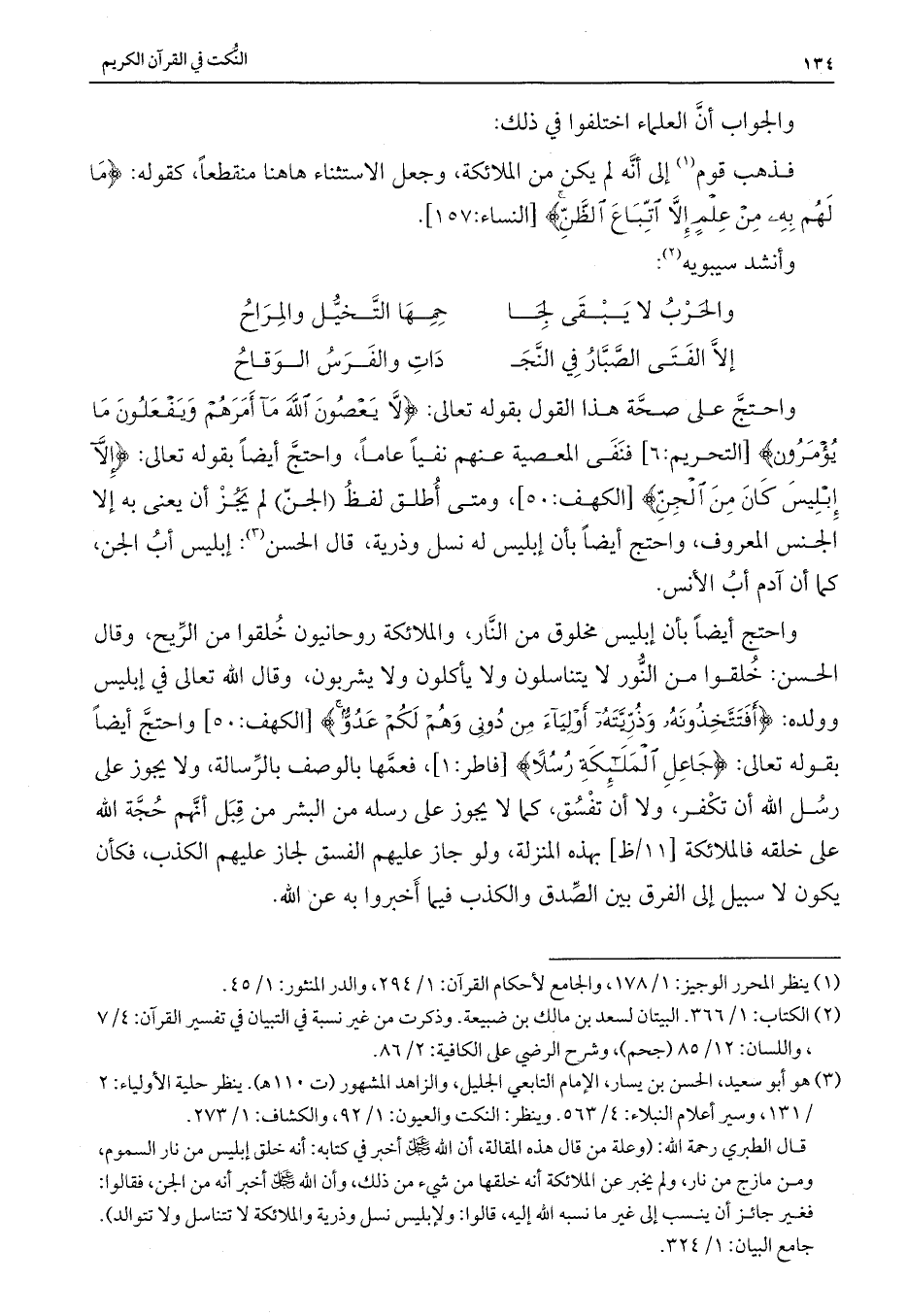 واحتج أيضاً بأن إبليس مخلوق من النَّار، والملائكو روحانيون خُلقوا من الريح، وقال الحسن: خُلقوا من النور لا يتناسلون ولا يأكلون ولا يشربون، وقال الله تعالى في إبليس وولده: {أَفَتَتَّخِذُونَهُ وَذُرِّيَّتَهُ أَوْلِيَاءَ مِنْ دُونِي وَهُمْ لَكُمْ عَدُوٌّ} [الكهف: 50] واحتج أيضا بقوله تعالى: {جَاعِلِ الْمَلَائِكَةِ رُسُلًا} [فاطر: 1] ، فعمها بالوصف بالرسالة، ولا يجوز على رسل الله أن تكفر، ولا أن تفسق، كما لا يجوز على رسله من البشر من قبل أنهم حجة الله على خلقه فالملائكة [11/ط] بهذه المنزلة، ولو جاز عليهم الفسق لجاز عليهم الكذب، فكأن يكون لا سبيل إلى الفرق بين الصدق والكذب فيما أخبروا به عن الله.