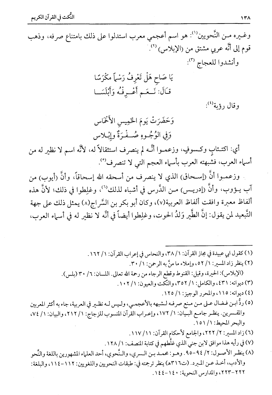 وزعموا أنَّ (إسحاق) الذي لا ينصرف من أسحقه الله إسحاقاً، وأنَّ (أيوب) من آب يؤوب، وأن (إدريس) من الدرس في أشباه لذلك، وغلطوا في ذلك؛ لأنَّ هذه ألفاظ معبرة وافقت ألفاظ العربية (7) ، وكان أبو بكر بن السراج (8) يمثل ذلك على جهة التبعيد لمن يقول: إن الطير ولد الحوت، وغلطوا أيضاً في أنه لا نظير له في أسماء العرب،