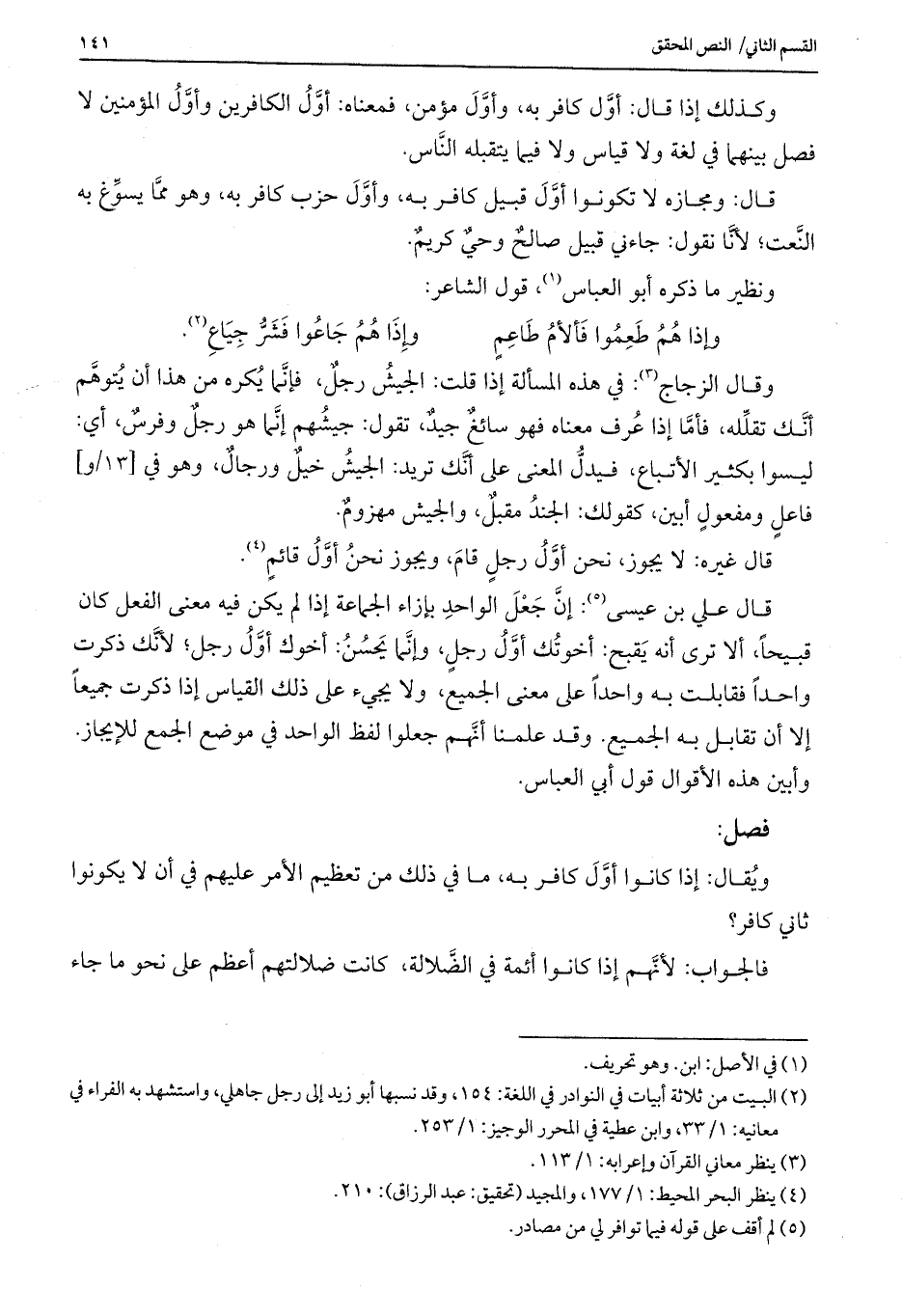 وكذلك إذا قال: أوَّل كافر به، وأوَّلَ مؤمن، فمعناه: أوَّلُ الكافرين وأوَّلُ المؤمنين لا فصل بينهما في لغة ولا قياس ولا فيما يتقبله النًّاس.