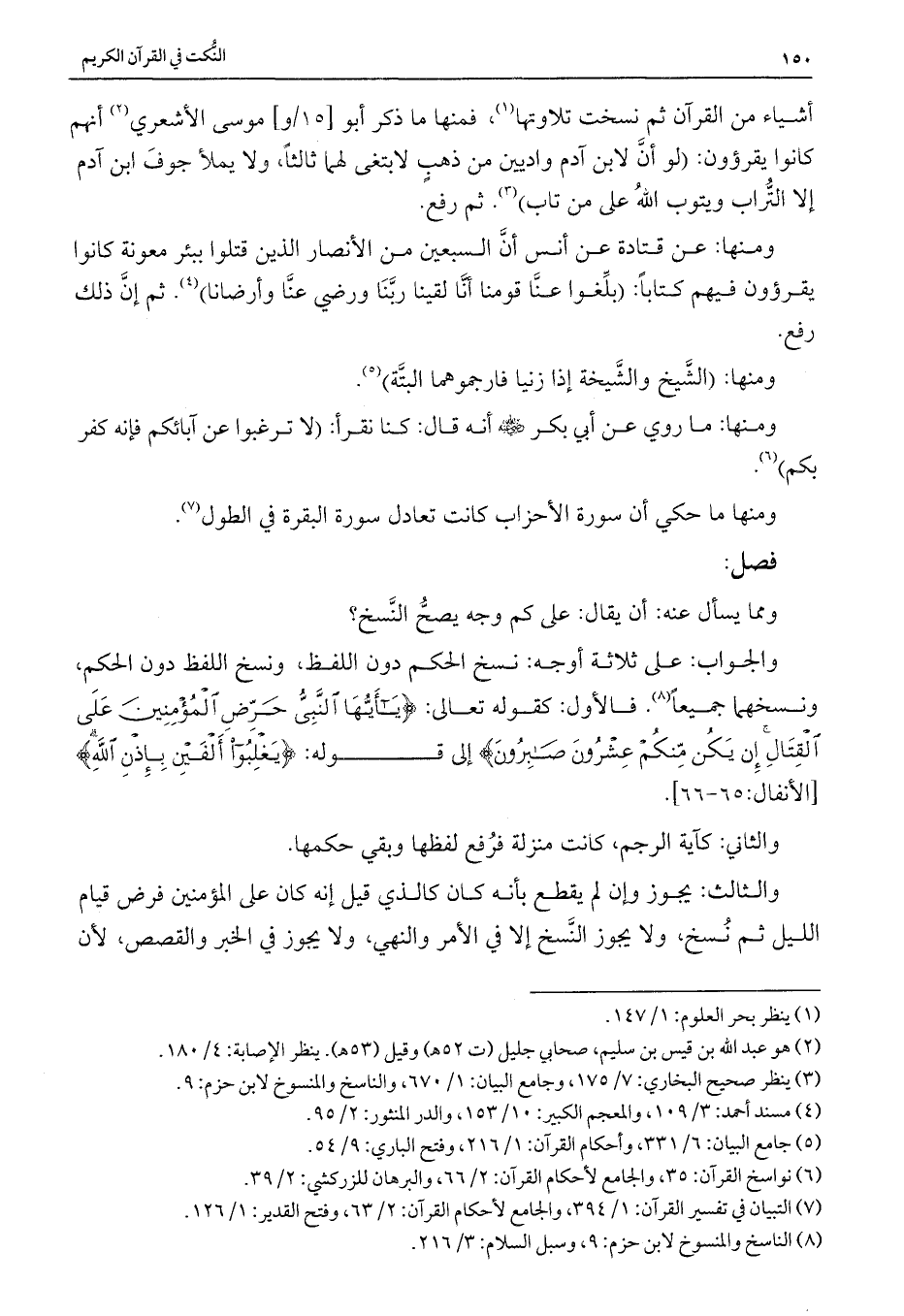 والجواب: على ثلاثة أوجه: نسخ الحكم دون اللفظ، ونسخ اللفظ دون الحكم، ونسخهما جميعاً. فالأول: كقوله تعالى: {يَا أَيُّهَا النَّبِيُّ حَرِّضِ الْمُؤْمِنِينَ عَلَى الْقِتَالِ إِنْ يَكُنْ مِنْكُمْ عِشْرُونَ صَابِرُونَ} إلى قوله: {يَغْلِبُوا أَلْفَيْنِ بِإِذْنِ اللَّهِ} [الأنفال: 65-66] .
