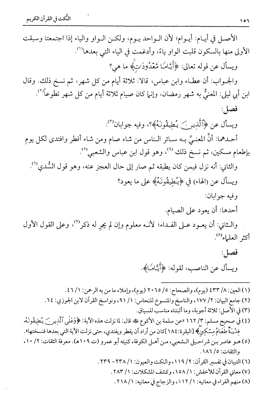 والجواب: أن عطاء وابن عباس، قالا: ثلاثة أيام من كل شهر، ثم نسخ ذلك. وقال ابن أبي ليلى: المعنىُّ به شهر رمضان، وإنما كان صيام ثلاثة أيام من كل شهر تطوعاً.