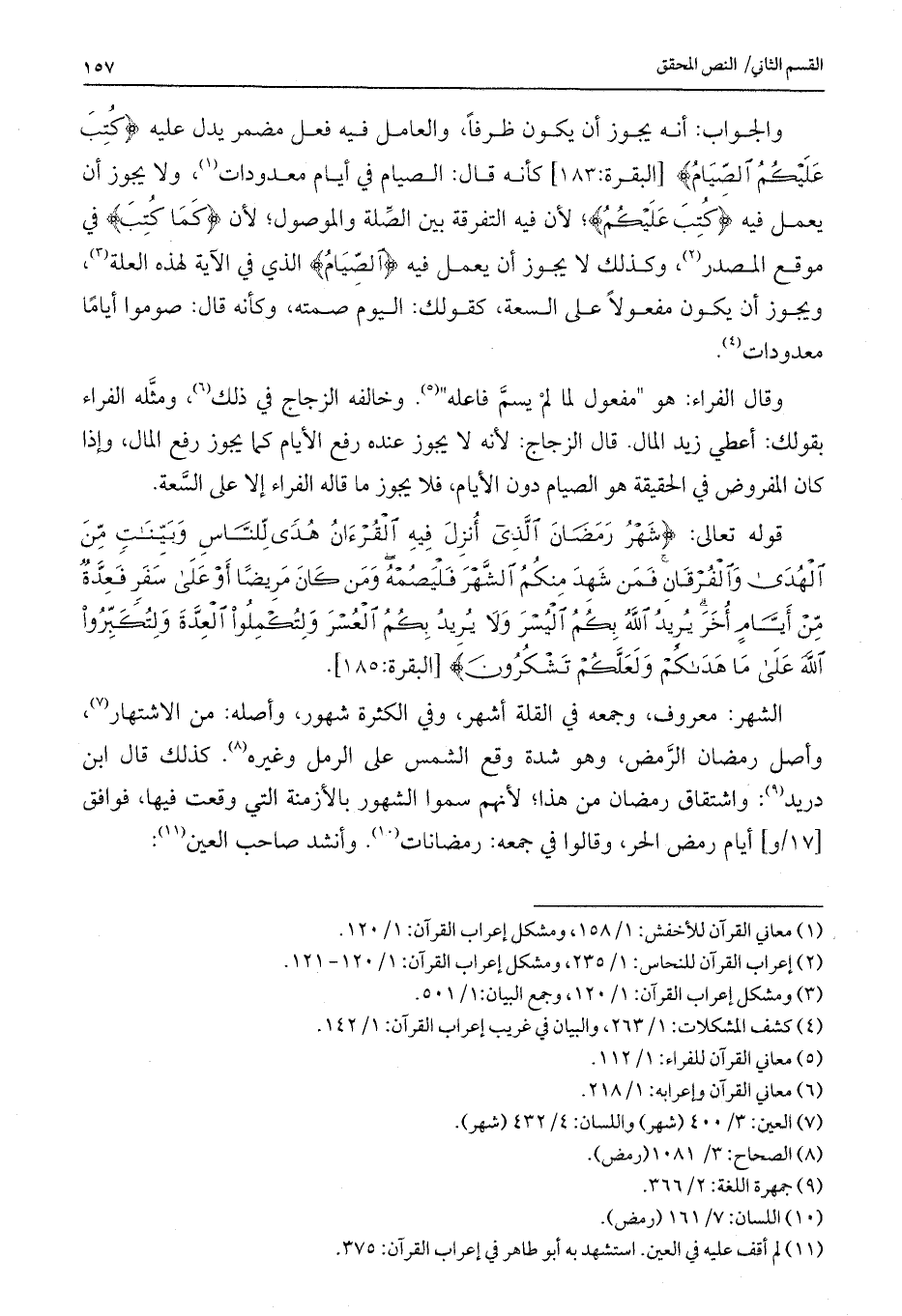 وقال الفراء: هو "مفعول لما لمْ يسمَّ فاعله". وخالفه الزجاج في ذلك، ومثله الفراء بقولك أعطي زيد المال. قال الزجاج: لأنه لا يجوز عنده رفع الأيام كما يجوز رفع المال، وإذا كان المفروض في الحقيقة هو الصيام دون الأيام، فلا يجوز ما قاله الفراء إلا على السعة.