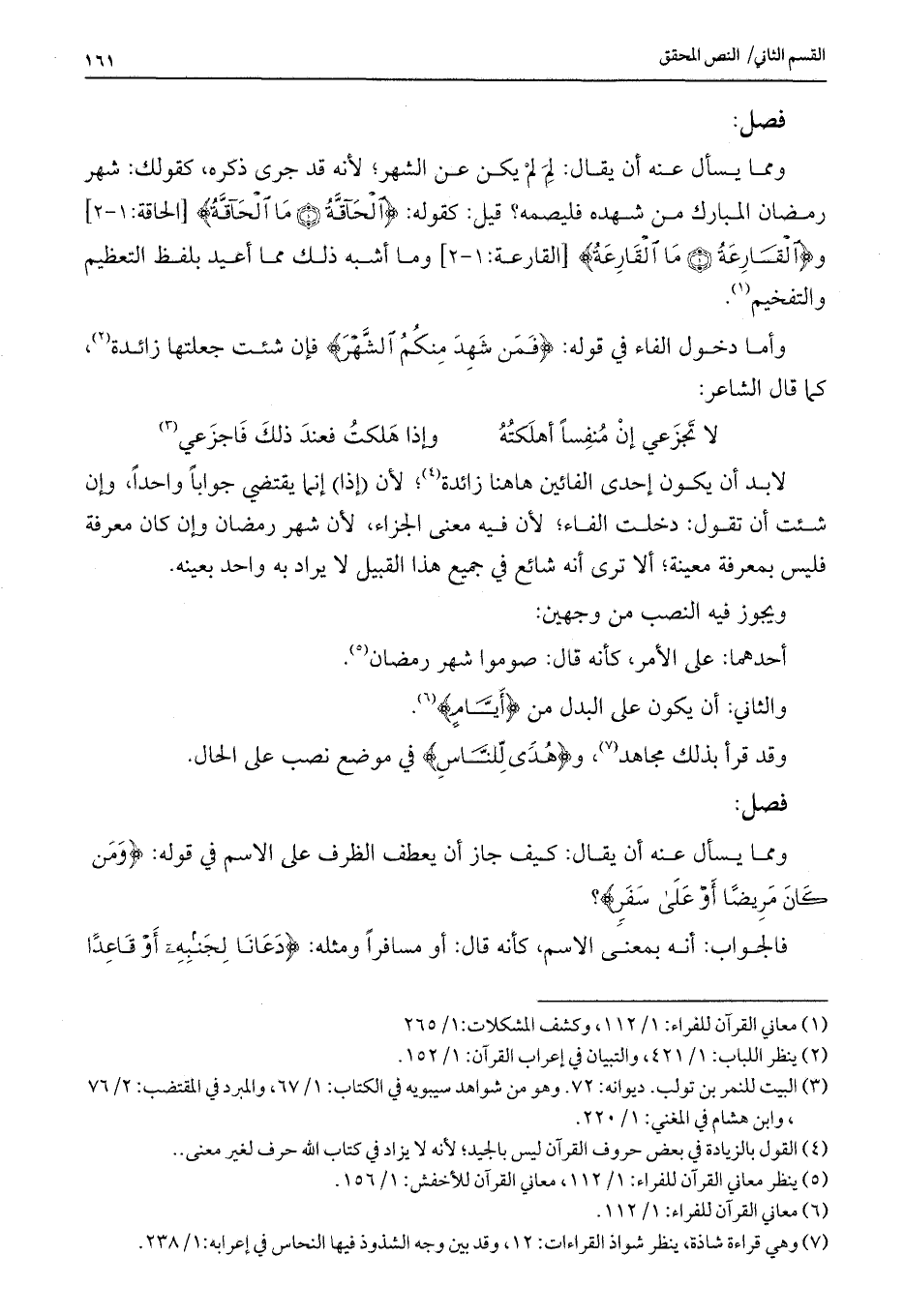 ومما يسأل عنه أن يقال: لِمَ لمْ يكن عن الشهر؛ لأنه قد جرى ذكره، كقولك: شهر رمضان المبارك من شهجه فليصمه؟ قيل: كقوله: {الْحَاقَّةُ (1) مَا الْحَاقَّةُ} [الحاقة 1-2] و {الْقَارِعَةُ (1) مَا الْقَارِعَةُ} [القارعة 1-2] وما أشبة ذلك مما أعيد بلفظ التعظيم والتفخيم.