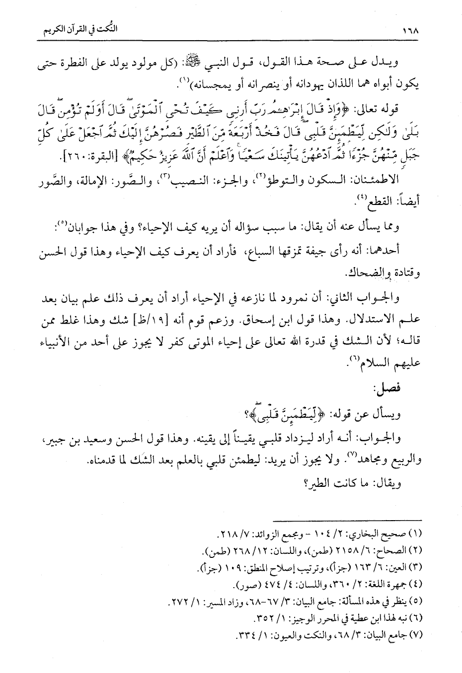 قوله تعالى: {وَإِذْ قَالَ إِبْرَاهِيمُ رَبِّ أَرِنِي كَيْفَ تُحْيِي الْمَوْتَى قَالَ أَوَلَمْ تُؤْمِنْ قَالَ بَلَى وَلَكِنْ لِيَطْمَئِنَّ قَلْبِي قَالَ فَخُذْ أَرْبَعَةً مِنَ الطَّيْرِ فَصُرْهُنَّ إِلَيْكَ ثُمَّ اجْعَلْ عَلَى كُلِّ جَبَلٍ مِنْهُنَّ جُزْءًا ثُمَّ ادْعُهُنَّ يَأْتِينَكَ سَعْيًا وَاعْلَمْ أَنَّ اللَّهَ عَزِيزٌ حَكِيمٌ} [البقرة: 260] .