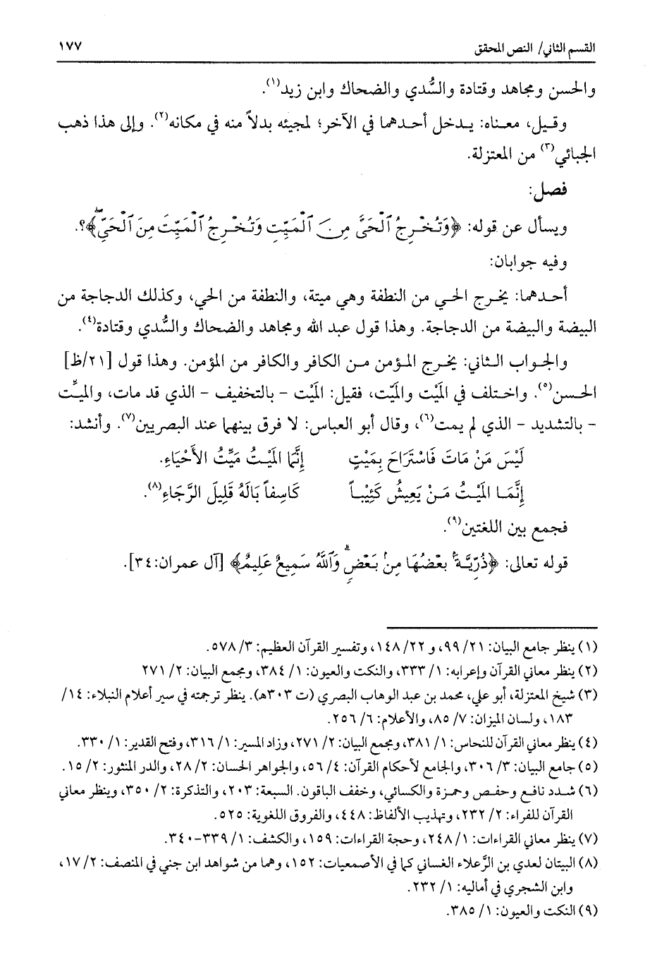 والجواب الثاني: يخرج المؤمن من الكافر والكافر من المؤمن. وهذا قول الحسن. واختلف في الَمْيت والَميّت، فقيل: الَمْيت - بالتخفيف - الذي قد مات والميَّت - بالتشديد - الذي لم يمت، وقال أبو عباس: لا فرق بينهما عند البصريين. وأنشد: