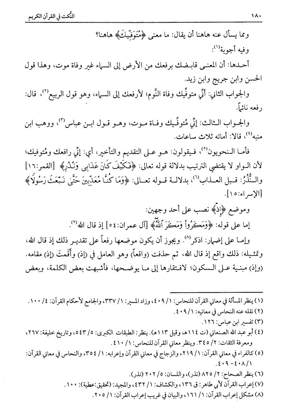 فأما النحويون، فيقولون: هو على التقديم والتأخير، أي: إني رافعك ومتوفيك؛ لأن الواو لا يقتضي الترتيب بدلالة قوله تعالى: {فَكَيْفَ كَانَ عَذَابِي وَنُذُرِ} [القمر: 16] والنذر: قبل العذاب، بدلالة قوله تعالى: {وَمَا كُنَّا مُعَذِّبِينَ حَتَّى نَبْعَثَ رَسُولًا} [الإسراء: 15] .