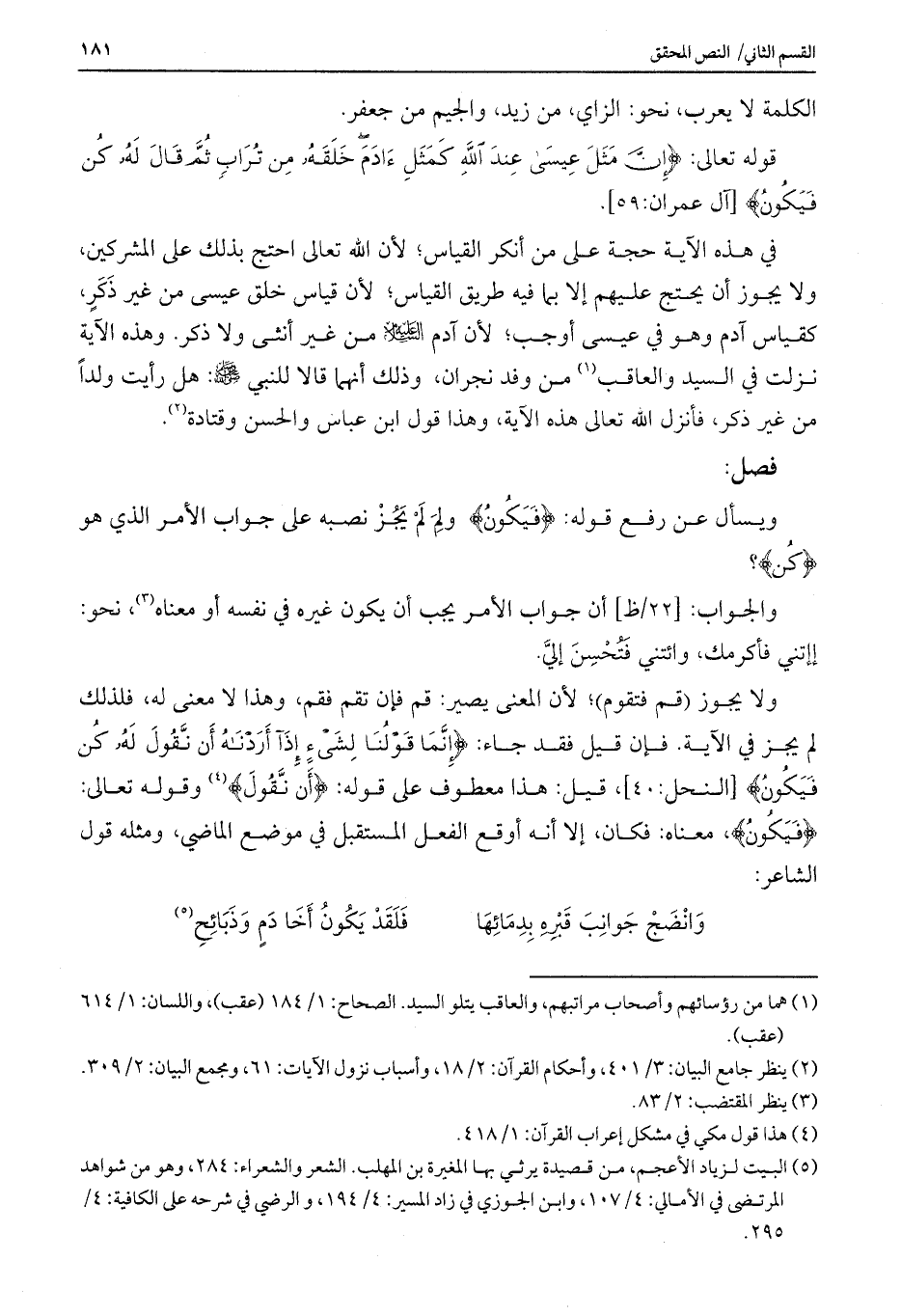 ولا يجوز (قم فتقوم) ؛ لأن المعنى يصير: قم فإن تقم فقم، وهذا لا معنى له، فلذلك لم يجز في الآية. فإن قيل فقد جاء: {إِنَّمَا قَوْلُنَا لِشَيْءٍ إِذَا أَرَدْنَاهُ أَنْ نَقُولَ لَهُ كُنْ فَيَكُونُ} [النحل: 40] ، قيل: هذا معطوف على قوله: {أَنْ نَقُولَ} وقوله تعالى: {فَيَكُونُ} ، معناه: فكان، إلا أنه أوقع الفعل امستقبل في موضع الماضي، ومثله قول الشاعر: