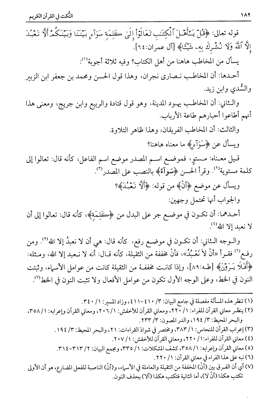 والوجه الثاني: أن تكون في موضع رفع، كأنه قال: هي أن لا نعبد إلا الله. ومن رفع فقرأ "أنْ لاَ نَعْبُدُ"، فأنْ مخففة من الثقيلة، كأنه قال: أنه لا نعبد إلا الله، ومثله: {أَفَلَا يَرَوْنَ} [طه: 89] ، وإذا كانت مخففة من الثقيلة كانت من عوامل الأسماء، وثبتت النون في الخط، وعلى الوجه الأول تكون من عوامل الأفعال ولا تثبت النون في الخط.