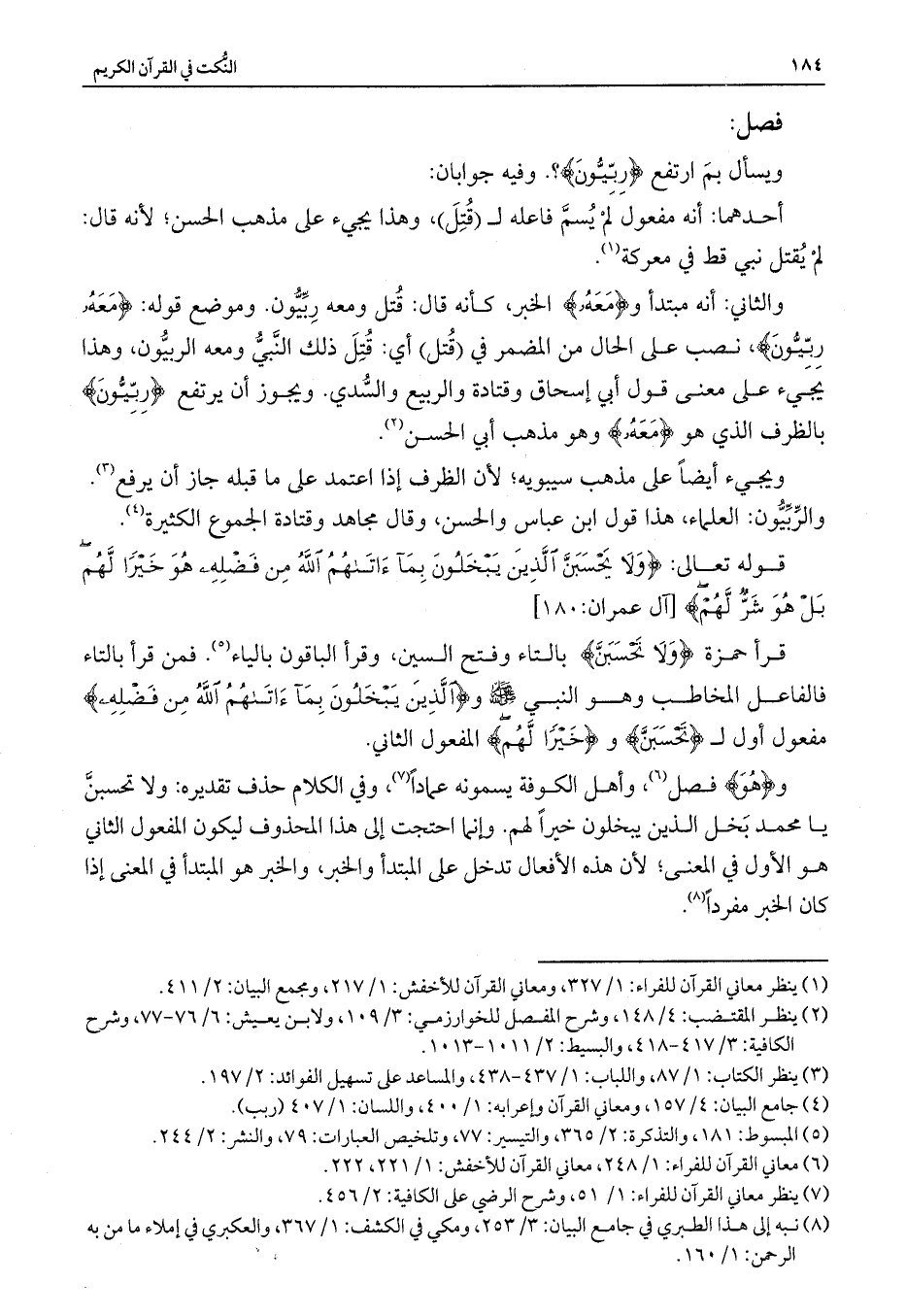 و {هُوَ} فصل، وأهل الكوفة يسمونه عمادا، وفي الكلام حذف تقديره: ولا تحسبن يا محمد بخل الذين يبخلون خيرا لهم. وإنما احتجت إلى هذا المحذوف ليكون المفعول الثاني هو الأول في المعنى؛ لأن هذه الأفعال تدخل على المبتدأ والخبر، والخبر هو المبتدأ في المعنى إذا كان الخبر مفرداً.