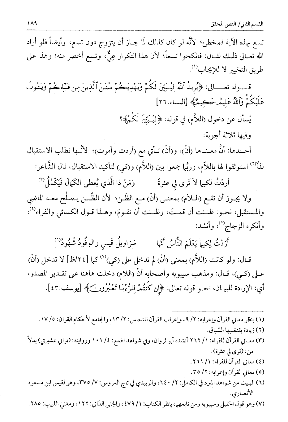 قال: ولو كانت (اللام) بمعنى (أنْ) لم تدخل على (كي) كما لا تدخل (أنْ) عل (كي) ، قال: مذهب سيبويه وأصحابه أن (اللام) دخلت هاهنا على تقدير المصدر، أي: الإرادة للبيان، نحو قوله تعالى: {إِنْ كُنْتُمْ لِلرُّؤْيَا تَعْبُرُونَ} [يوسف: 43] .
