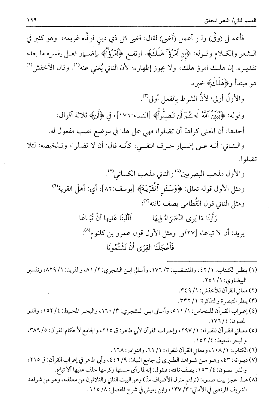 فأعمل (وفًّي) ولو أعمل (قَضى) لقال: قضى كل ذي دين فوفاه غريمه، وهو كثير في الشعر والكلام وقوله: {إِنِ امْرُؤٌ هَلَكَ} . ارتفع {امْرُؤٌ} بإضمار فعل يفسره ما بعده تقديره: إن هلك امرؤ هلك، ولا يجوز إظهاره؛ لأن الثاني يغني عنه. وقال الأخفش هو مبتدأ و {هَلَكَ} خبره.