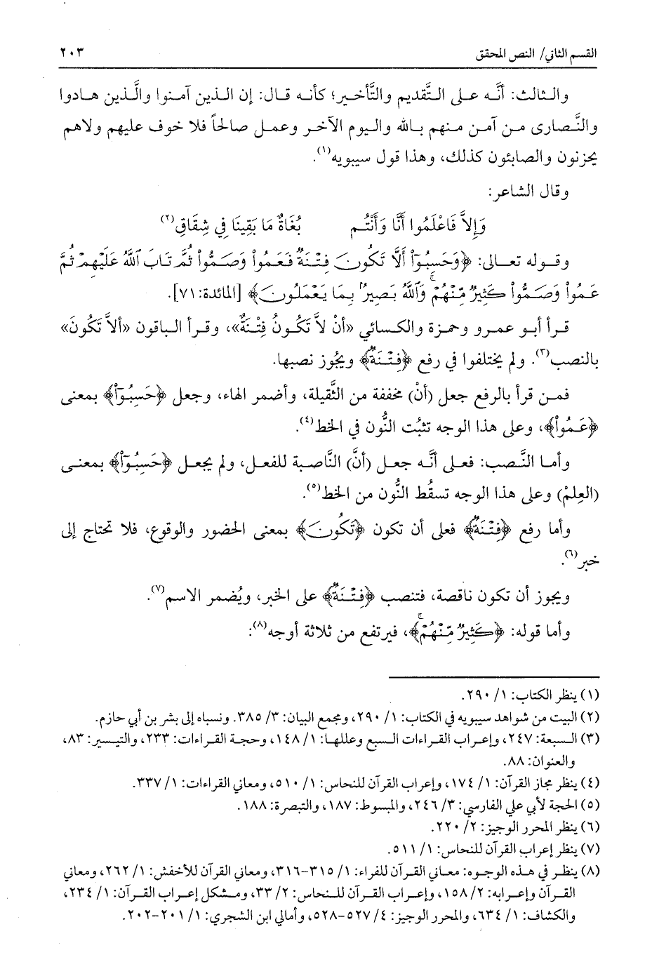 أما النصب: فعلى أنه جعل (أن) الناصبة للفعل، ولم يجعل {حَسِبُواْ} بمعنى (العلم) وعلى هذا الوجه تسقط النون من الخط.