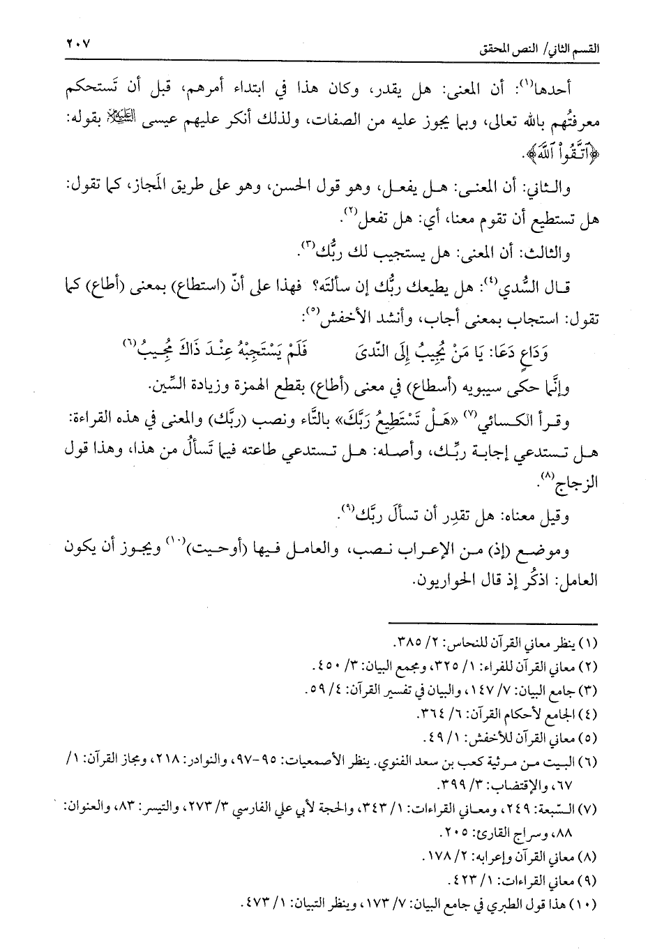 وقرأ الكسائي "هلى تستطيعُ ربَّكَ" بالتاء ونصب (ربًّك) والمعنى في هذه القراءة: هل تستدعي إجابة ربك، وأصله: هل تستدعي طاعته فيما تسألُ من هذا، وهذا قول الزجاج.