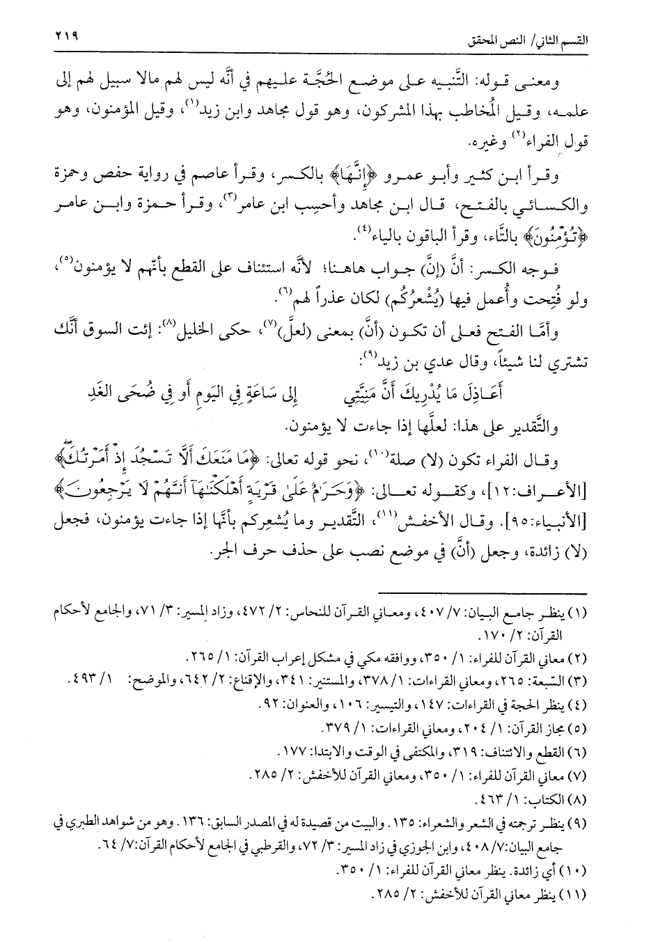 وقال الفراء تكون (لا) صلة، نحو قوله تعالى: {مَا مَنَعَكَ أَلَّا تَسْجُدَ إِذْ أَمَرْتُكَ} [الأعراف: 12] ، كقوله تعالى: {وَحَرَامٌ عَلَى قَرْيَةٍ أَهْلَكْنَاهَا أَنَّهُمْ لَا يَرْجِعُونَ} [الأنبياء: 95] . وقال الأحفش، التقدير وما يشعركم بأنها إذا جاءت يؤمنون، فجعل (لا) زائدة، وجعل (أن) في موضع نصب على حذف حرف الجر.